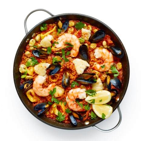 Spanish paella made in a traditional pan – the original of the dish did not feature seafood, but chicken, rabbit and, occasionally, snails. Photograph: martiapunts/Getty Images/iStockphoto